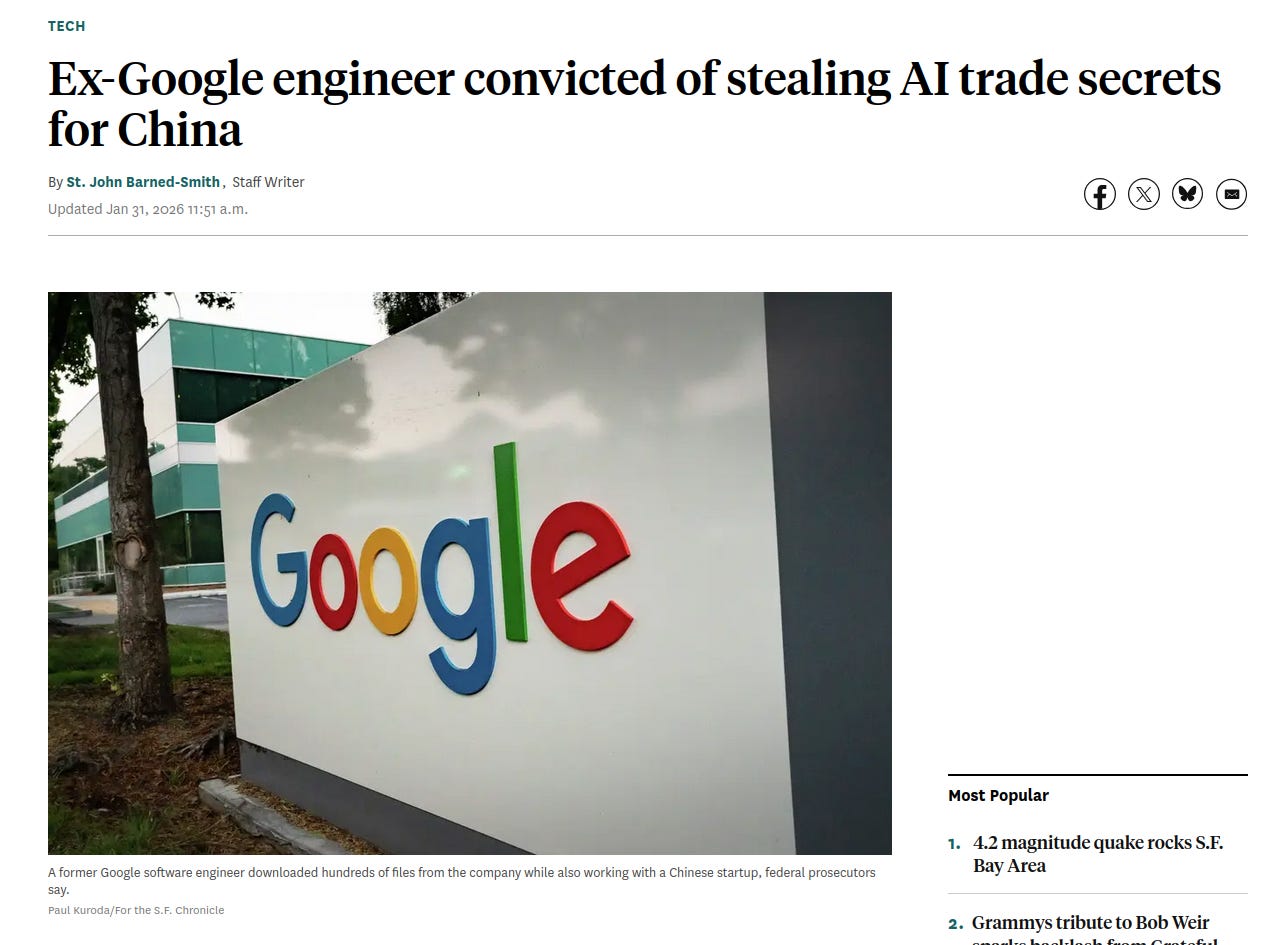 The defendant, Linwei Ding, age thirty eight at indictment, joined Google in 2019. According to the San Francisco Chronicle, while employed he discussed a chief technology officer role with a Chinese startup, earned a monthly stipend, and pitched investors on replicating Google’s AI supercomputer using knowledge taken from his day job. The Chronicle also reports he applied to a government talent program in Shanghai that incentivizes contributions to national AI capability.